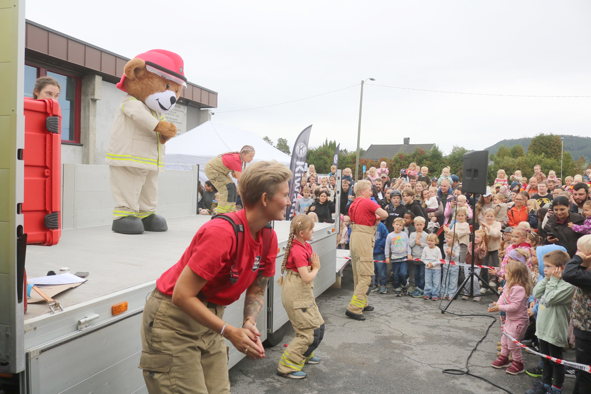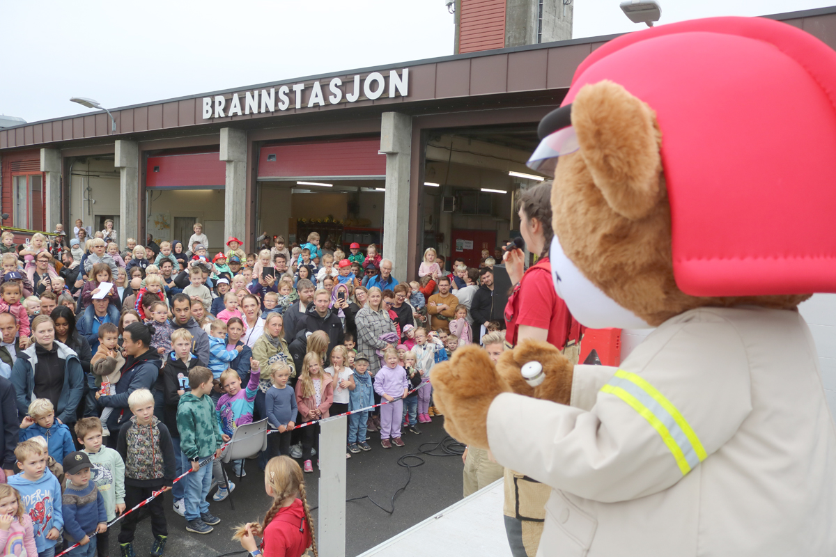 Store og små «brannfolk» hjalp til med showet til Bjørnis. Denne bamsen er blitt kjempepopulær og folk reiser langt for å få med seg dette.