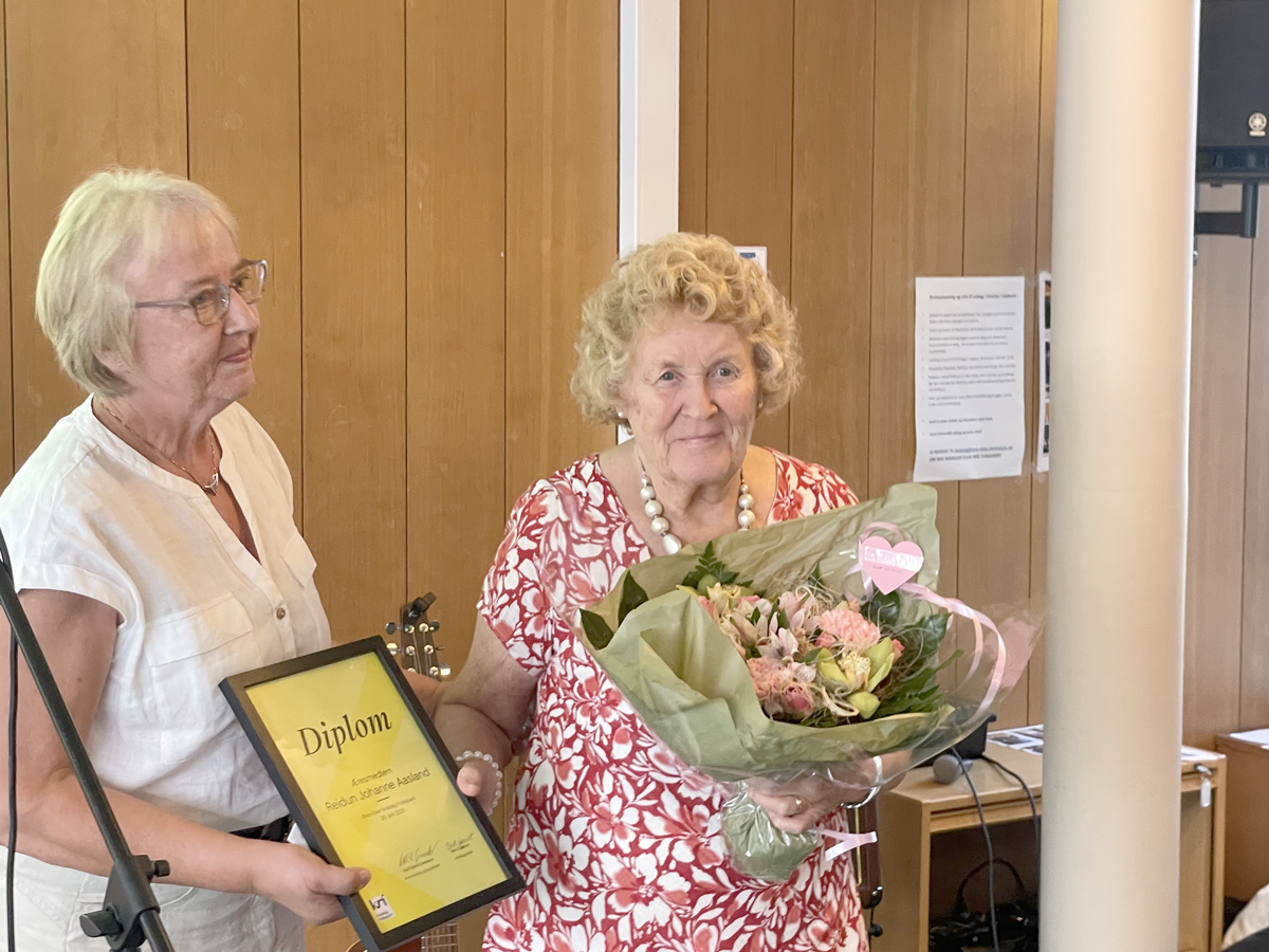 Solveig Berg Vego fra Buskerud KrF Kvinner delte også ut æresprisen til Reidun Aasland for hennes arbeid i kvinneorganisasjonen og hennes innsats i lokallaget over flere ti-år.