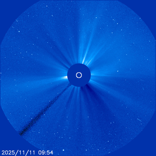 Bildet viser utbruddet som har kurs rett mot Jorden med enorm hastighet. Selve solskiven er dekket til for å kameraet ikke skal bli blendet. (Foto: SOHO/ESA/NASA)
