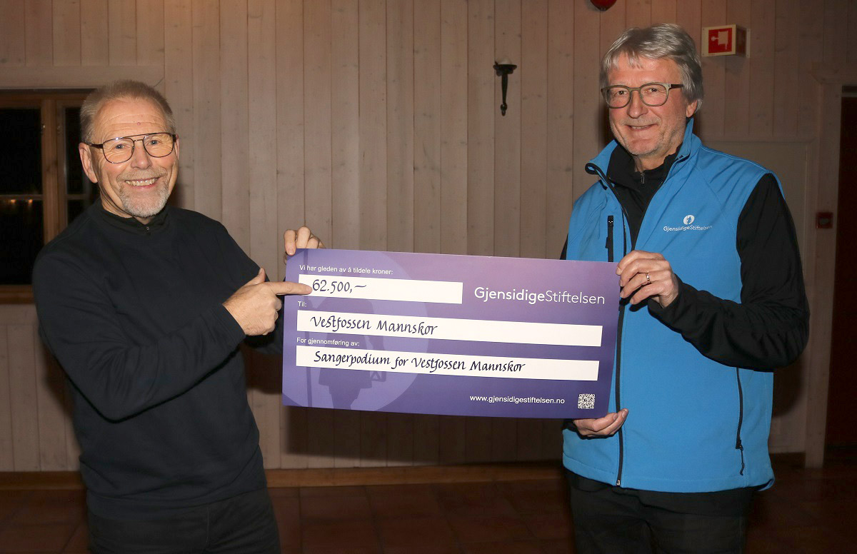 – Å fy flate. Dette var strålende! Nå skal vi kose oss. Det var Kjell Jakobsens ord etter at han overraskende fikk besøk av Jon Erik Lund i Gjensidigestiftelsen på Fossesholm i går kveld. Han trodde han skulle gi utfyllende informasjon om søknaden på 62.500 kroner til nytt sangerpodium som Vestfossen Mannskor hadde sendt inn. I stedet fikk han overrakt gavesjekken på samme beløp.