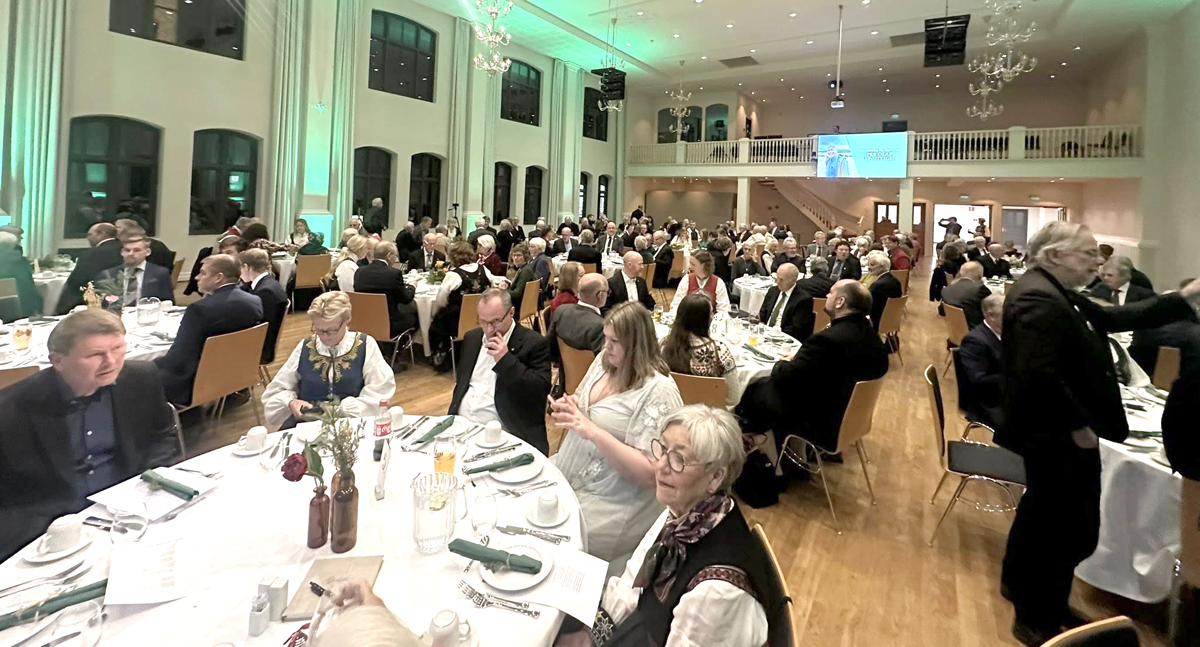 Kvelden ble fylt med mange taler, sang og musikk og god mat. Hovedretten besto selvsagt av kjøttkaker i brun saus. Skikkelig tradisjonsmat i god Senterpartistil.