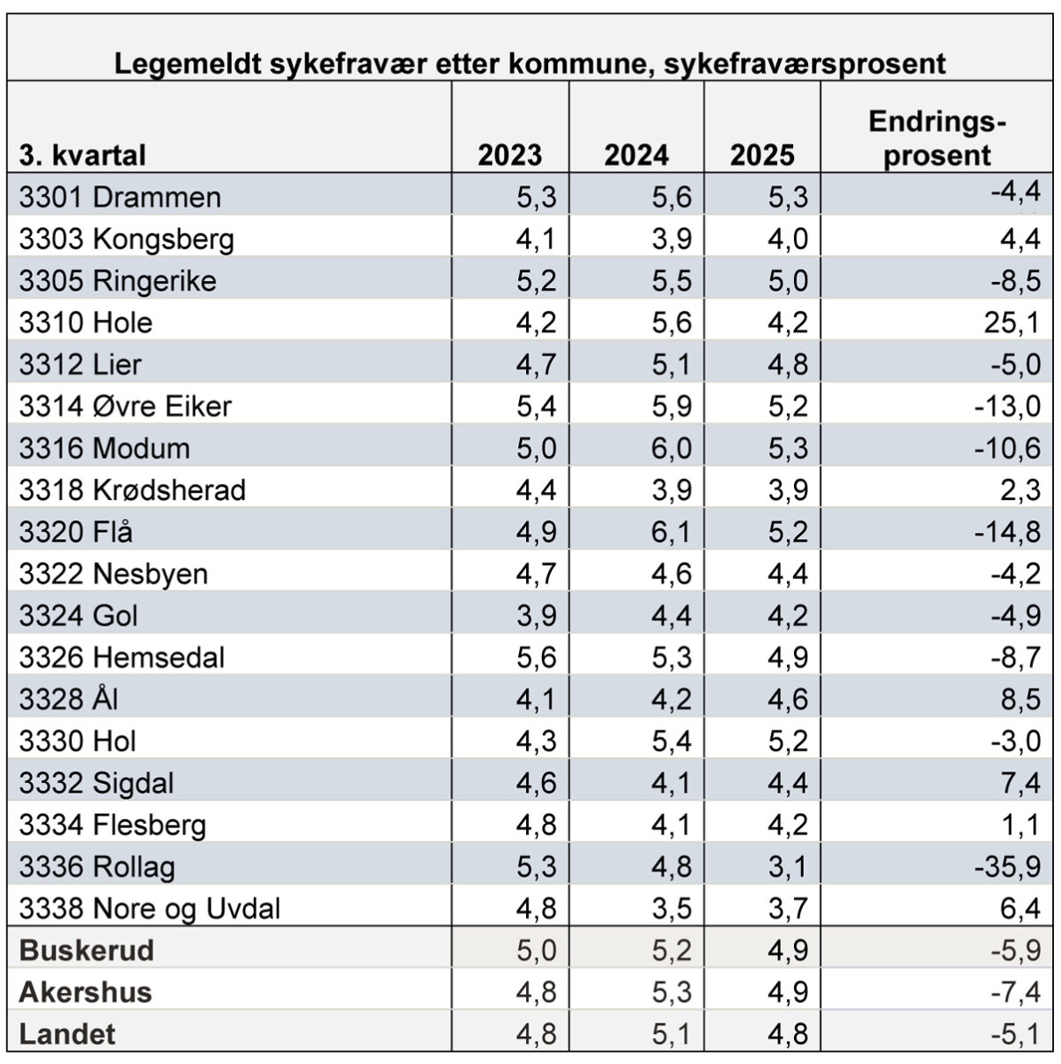 I tredje kvartal var det legemeldte sykefraværet på 4,9 prosent i Buskerud. Det er en nedgang på 5,8 prosent sammenlignet med samme periode i 2024.