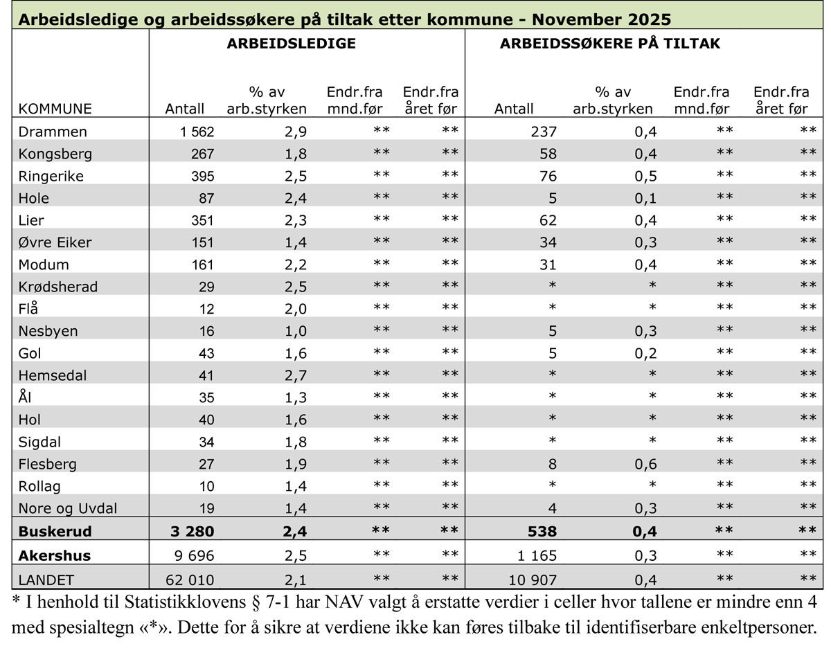 3.280 personer er registrert som helt ledige i Buskerud ved utgangen av november. Det utgjør 2,4 prosent av arbeidsstyrken. På grunn av feil i dataverktøyet til statistikken har det siden april i år ikke vært mulig å se utviklingen i ledigheten måned for måned.