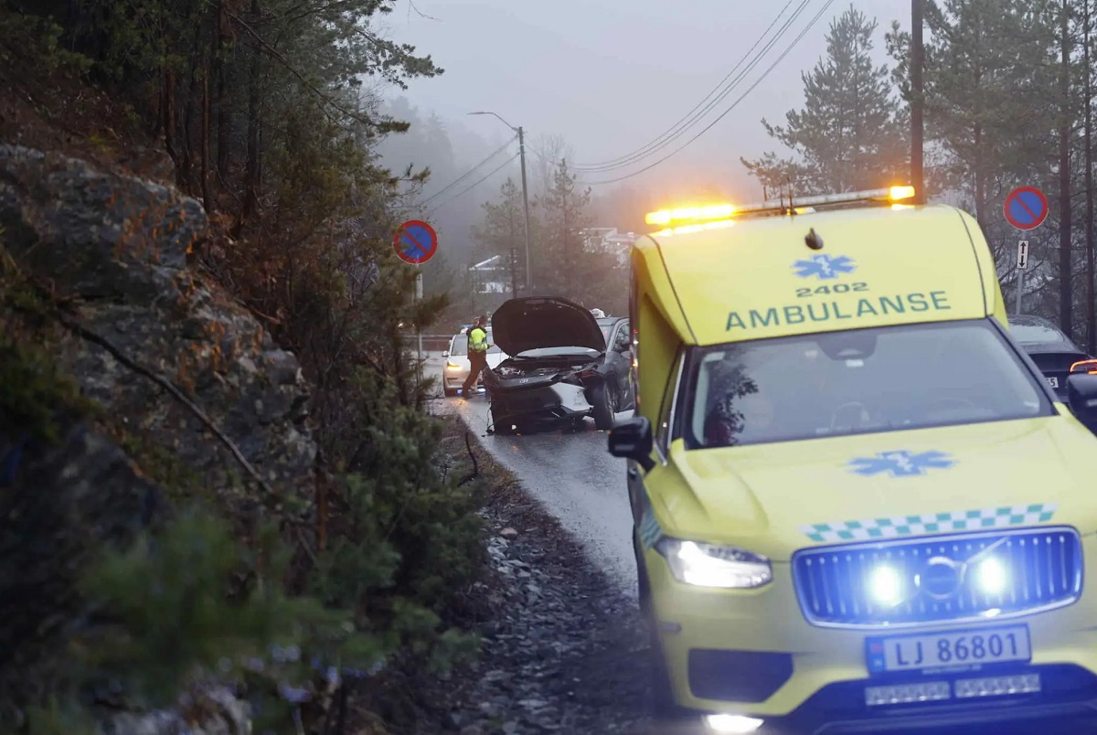 Bilen – en drosje fra distriktet hadde kjørt i fjellveggen og fått omfattende skader i fronten.