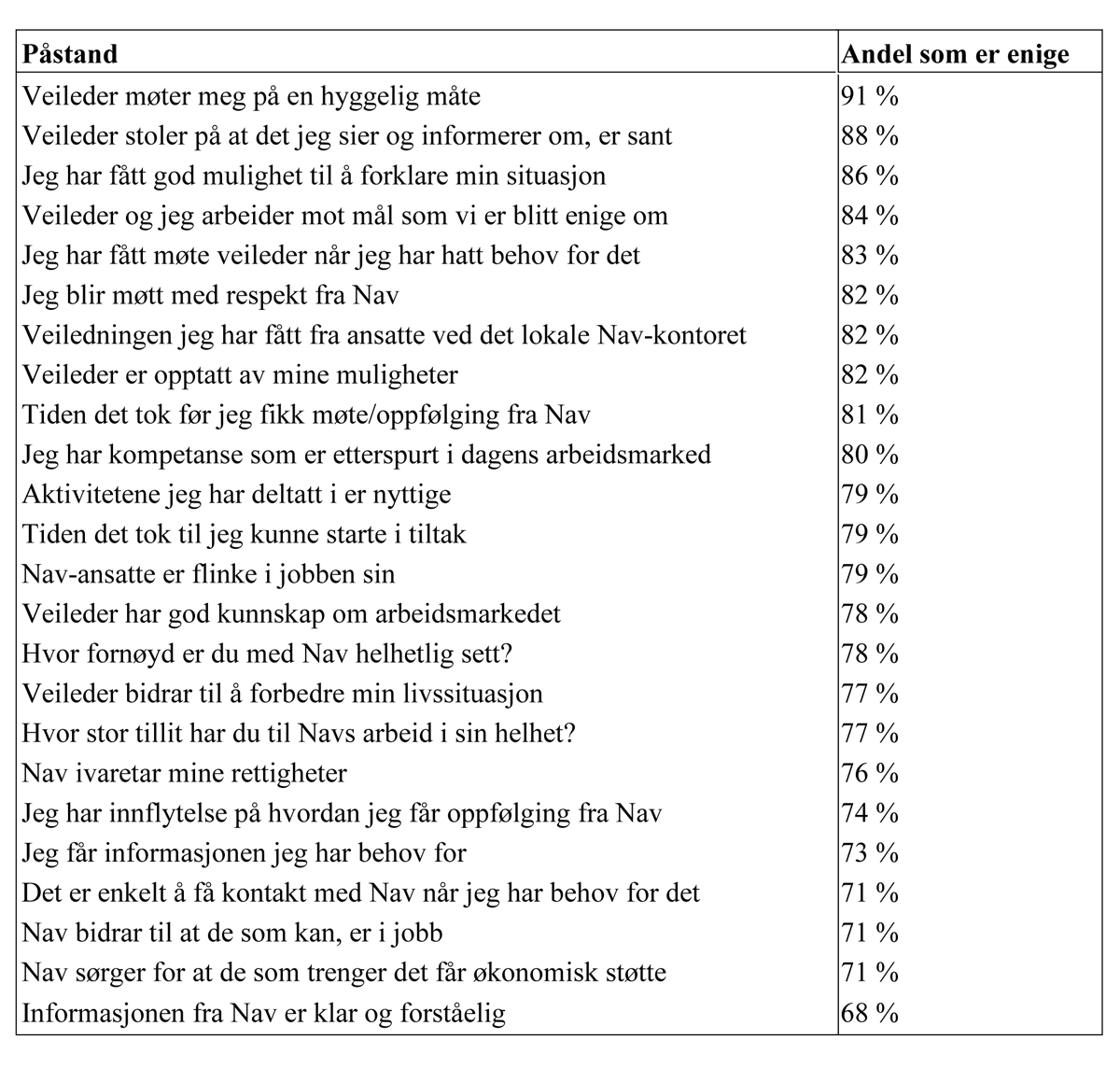 Ni av ti svarer at veilederen møter dem på en hyggelig måte, og 88 prosent opplever at veilederen stoler på dem. 86 prosent sier at de har fått god mulighet til å forklare sin situasjon, og 84 prosent opplever at de, sammen med veilederen, jobber mot et felles mål.
