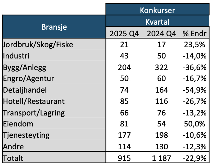 Det ble registrert 915 konkurser i fjerde kvartal 2025, mot 1.187 i samme kvartal året før. Det er en reduksjon i konkurser på 23,0 prosent. Nedgangen er særlig tydelig innen detaljhandel, bygg og anlegg samt industri.
