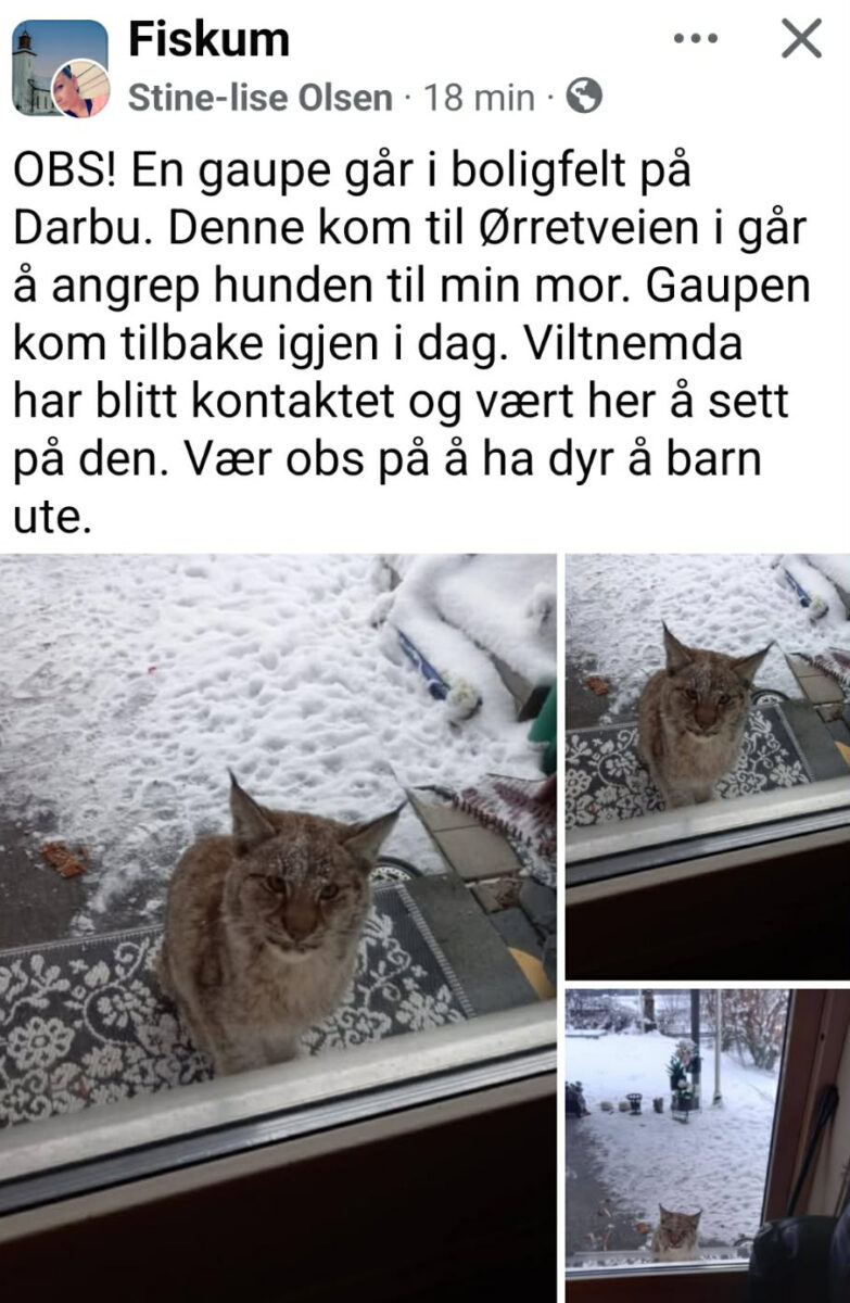Stine-Lise Olsen og familien fikk mildt sagt en vill opplevelse lørdag da hunden til hennes mor ble angrepet av en gaupe midt i boligområdet på Darbu. Dette skjedde ved 11.30-tiden og gaupa påførte hunden skader i det ene øyet, øret og i ansiktet.
