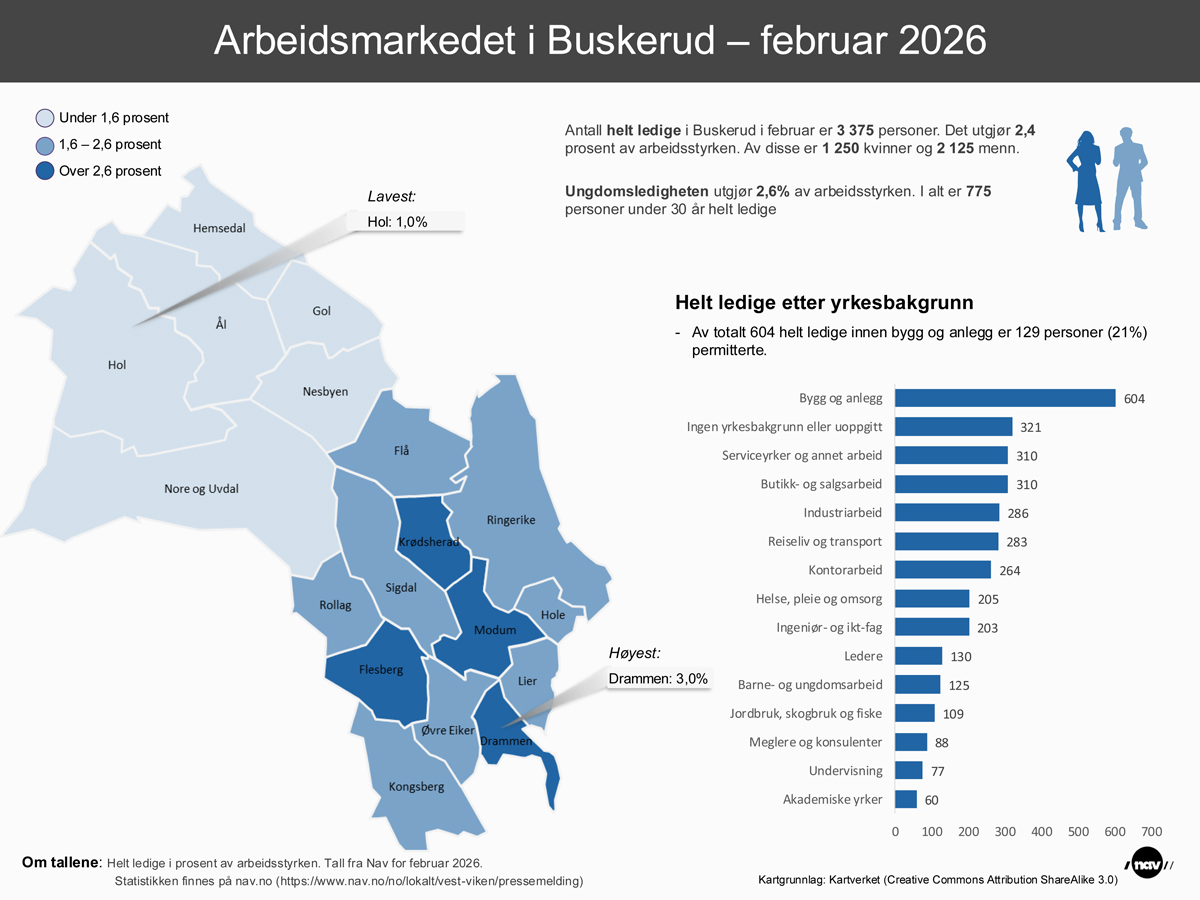 I februar var det 1.250 helt ledige kvinner i Buskerud, og 2.125 helt ledige menn i fylket. I den yngste aldersgruppen (16-29 år) var det 775 helt ledige i Buskerud i februar.