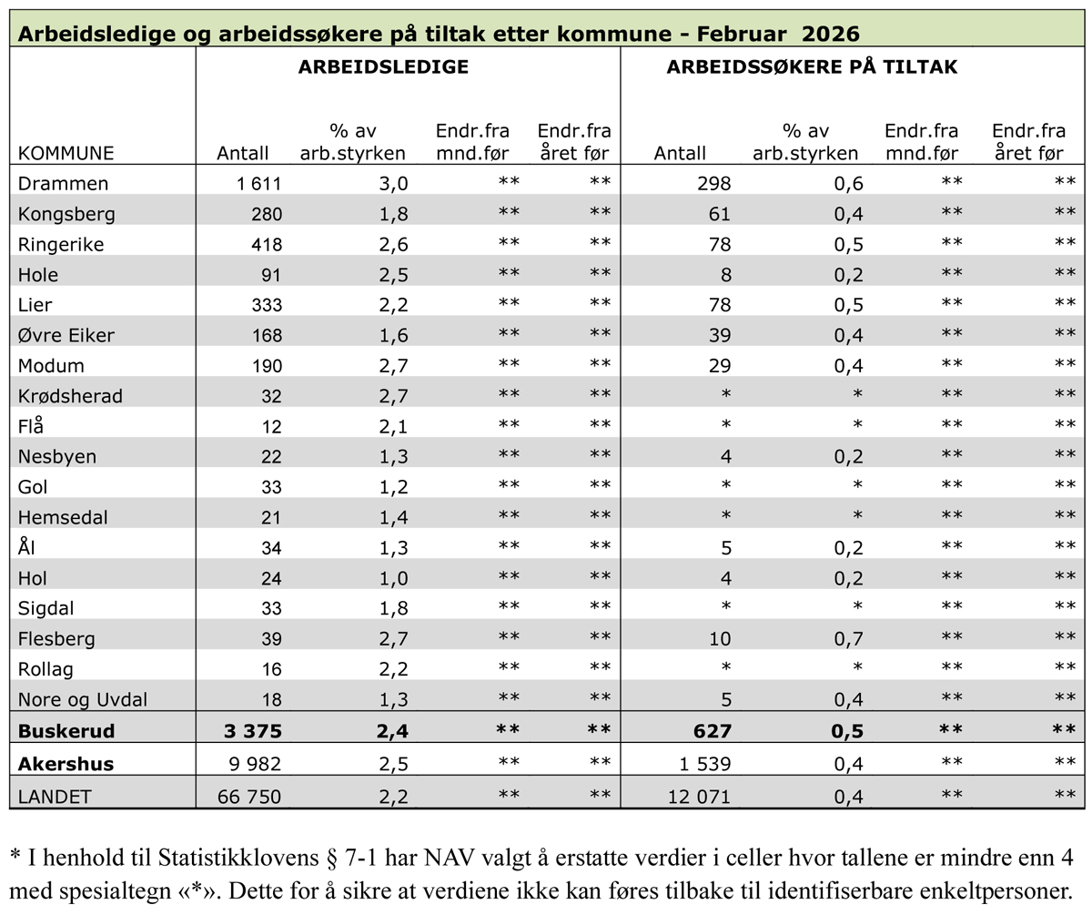 3.375 personer er registrert som helt ledige i Buskerud i februar. Det utgjør 2,4 prosent av arbeidsstyrken. I tillegg er det 1.224 delvis ledige, og 627 personer registrert som arbeidssøkere på tiltak. Totalt er 3,8 prosent av arbeidsstyrken i Buskerud registrert som arbeidssøkere.