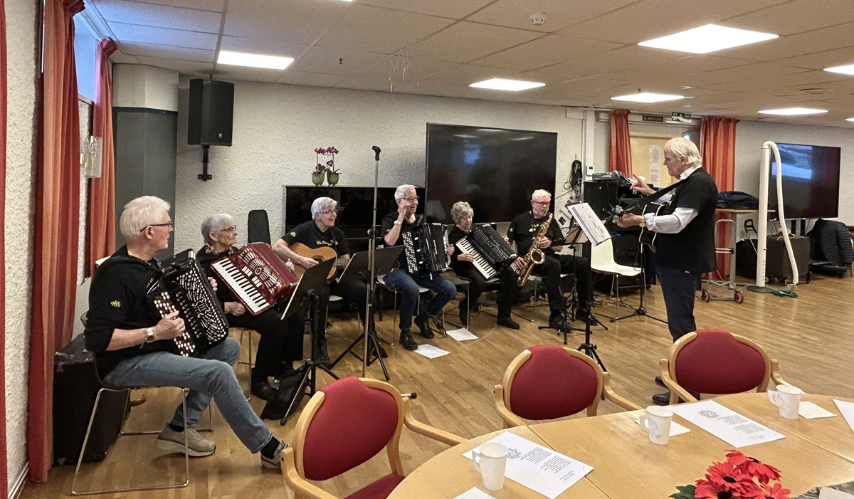 Gla’Musikken varmer opp før det strømmer på med eldre hjemmeboende og fra Eikertun og andre omsorgsboliger. Festsalen på Eikertun er deres faste holdepunkt hver onsdag.