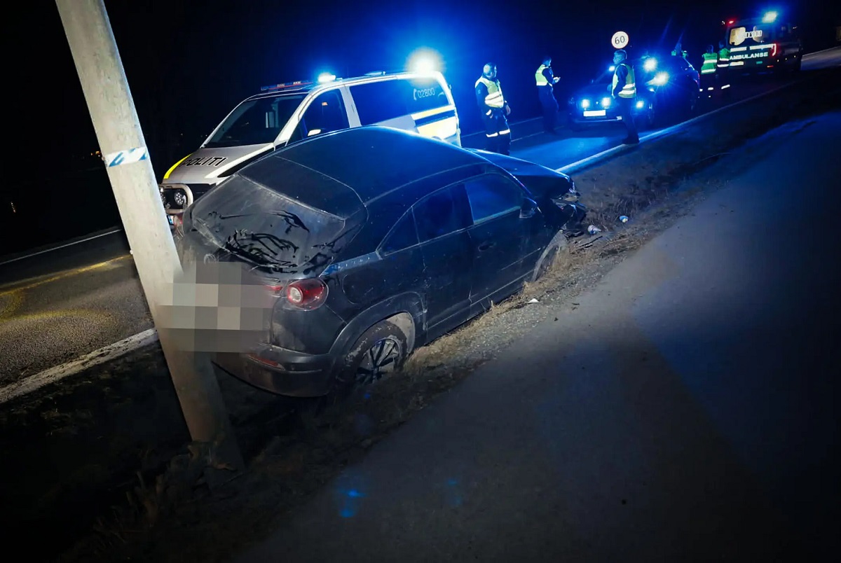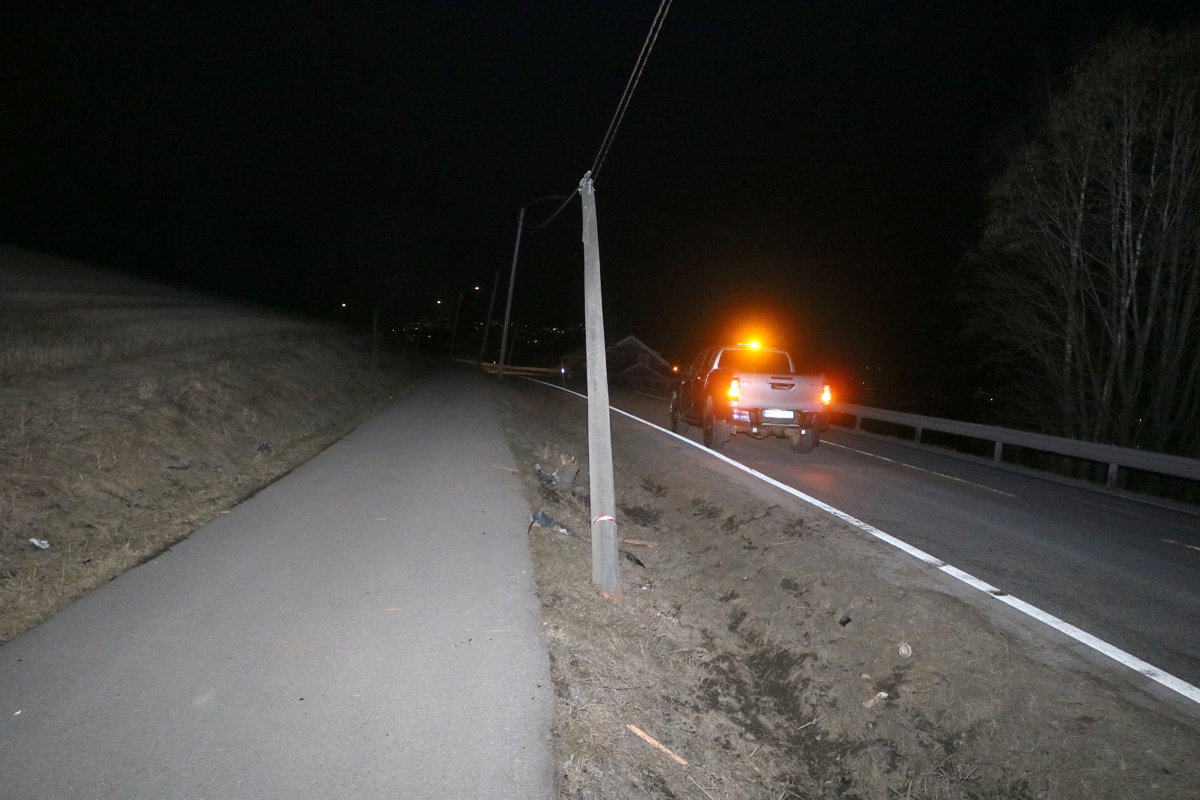 Det var klokken 23.06 at politiet meldte om utforkjøringen. En Mazda personbil hadde kjørt av veien og tatt med seg en lyktestolpe. Stolpen knakk rett av og ble flyttet flere meter i kjøreretningen. Bilen fikk store skader i fronten.