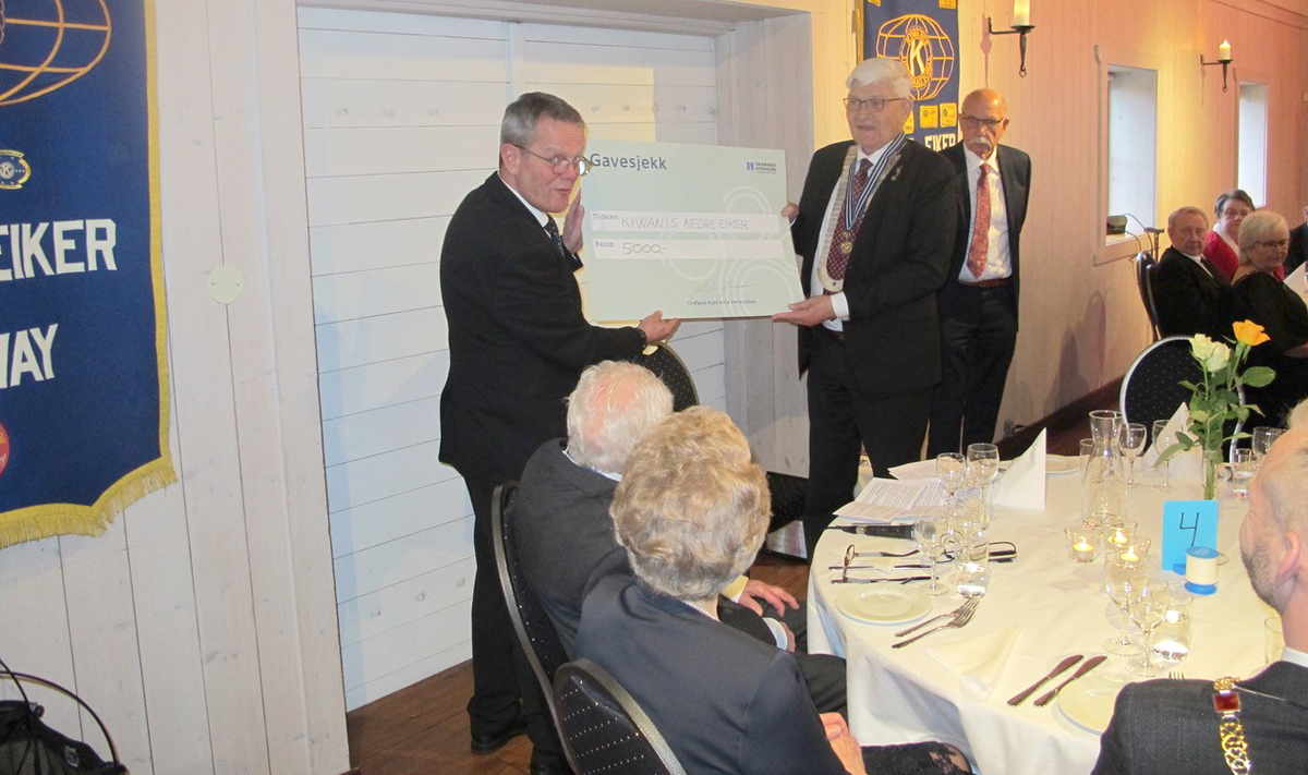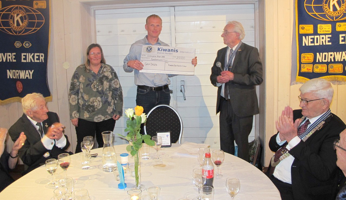 Fra KC Nedre Eiker ved Leder av Humanitær komité Helge Berget som overrakte 25.000 kroner til Grip-dagen som gir tilbud til ungdom og voksene med nedsatt funksjonsevne i gamle Nedre Eiker, mens støtte til speidergruppen i Frelsesarmeen vil bli overlevert ved en senere anledning.