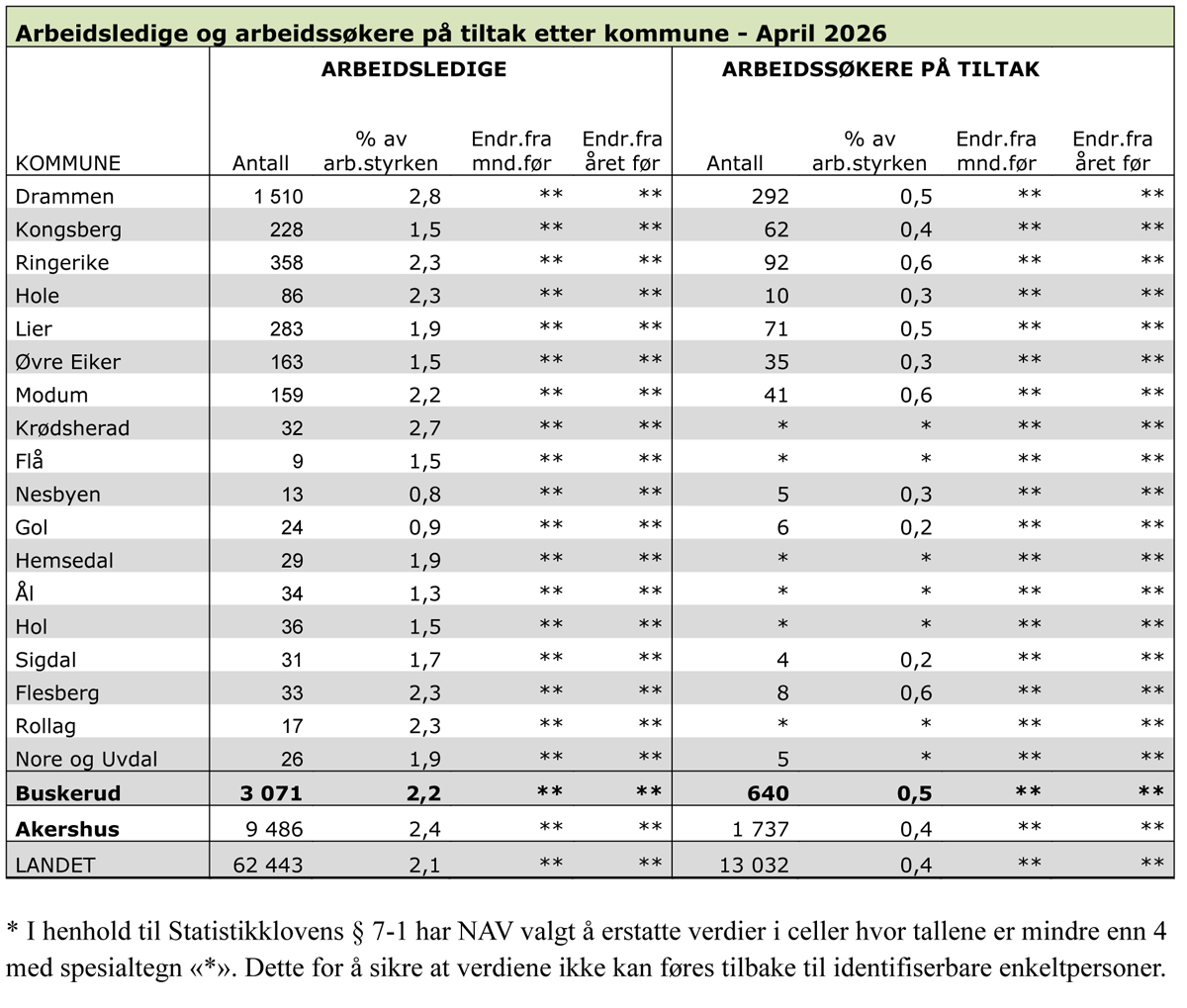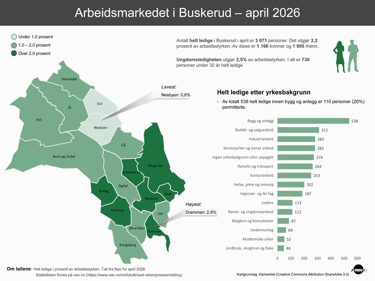 Drammen er kommunen med høyest ledighet i Buskerud i april. Her er 2,8 prosent av arbeidsstyrken helt ledige. Den laveste ledigheten i Buskerud finner vi Nesbyen kommune hvor er 0,8 prosent av arbeidsstyrken er helt arbeidsledige.